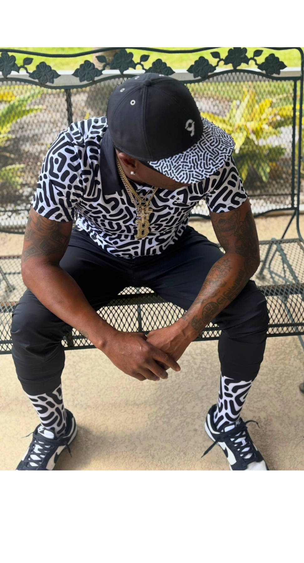 Edgy, modern, and unapologetic. The black-and-white maze print delivers swagger straight from the streets to the fairway. The performance polo keeps it breathable, while the snapback peaked cap completes the fit. Both shirt and hat feature the exclusive embroidered Bac9 logo, making this a limited edition drop built for players who don’t play safe.